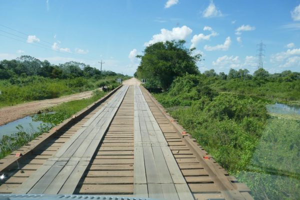 der Abenteuerstrasse die durch das Pantanal führt. Über hundert Brücken gibt es auf dem Weg bis nach Porto Jofre. Die ersten Brücken führen über Sumpfland.