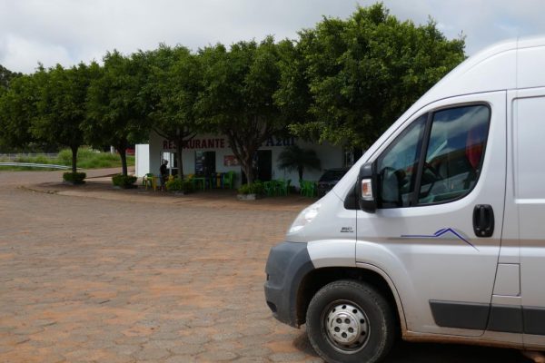 Gegen elf Uhr habe ich mich soweit erholt, dass wir losfahren können. Wäschestopp auf der Umfahrung von Cuiaba. Ab Mittwoch ist die Wäsche wieder abholbereit. Dann geht es weiter nach Poconé. Gross einkaufen geht nicht, da heute ein Feiertag ist. Aber Wasser, Chorizo und Gummibrötchen gibt es in einem kleinen Laden. Wir erreichen das Tor zur Transpantaneira,