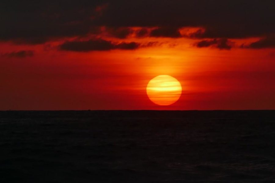 Heiss, Heiss. Im Schatten sitzen. Aufs Meer schauen. Die Flut steigt nach dem Vollmond besonders hoch und gegen Abend überschwemmen grosse Wellen einen Teil des Stellplatzes. Ein aufgeschütteter Sanddamm soll ein weiteres Ueberschwemmen verhindern.