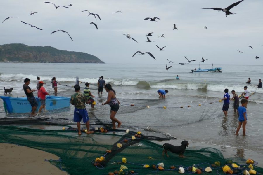 Wir fahren ins Dorf, die Fischer kehren vom nächtlichen Fischfang zurück. Kiste um Kiste werden Fische von Booten in einen Laster verladen. Fregattvögel umkreisen sie in einem Wirbel, schnappen sich im Flug Fische aus dem Fang. Pelikane warten im Wasser auf ihren Anteil. In kleinen Booten und an Ständen werden Fische zum Kauf angeboten. Herrliches Schauspiel.