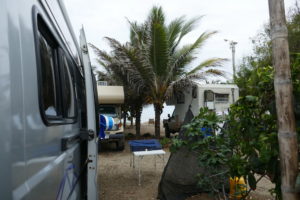 In Puerto Lopez, Camping Café Madame wegen Wassermangel geschlossen. Stellplatz am Meer. Fischerboote liegen am Strand. Ruhiges Wasser.