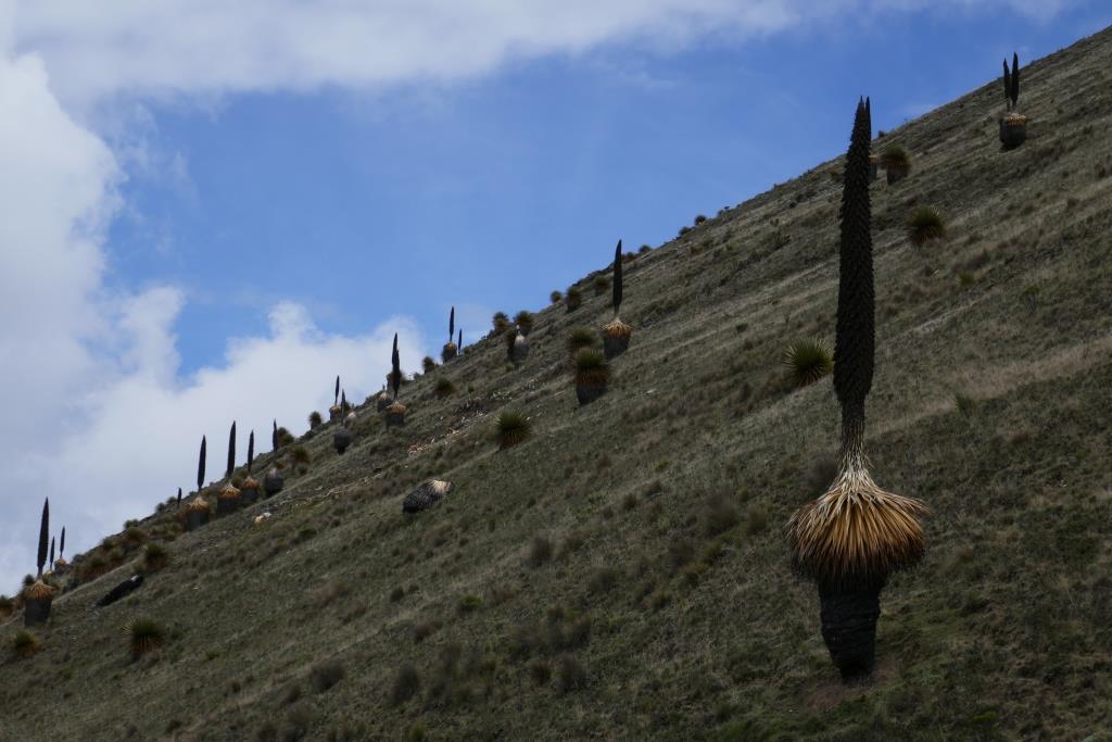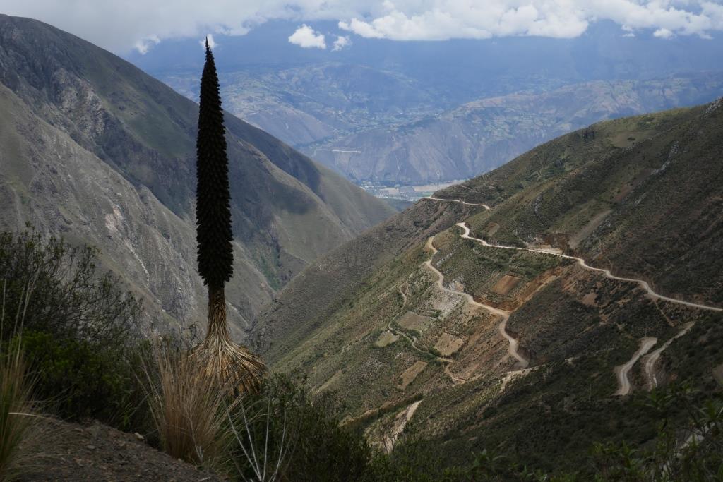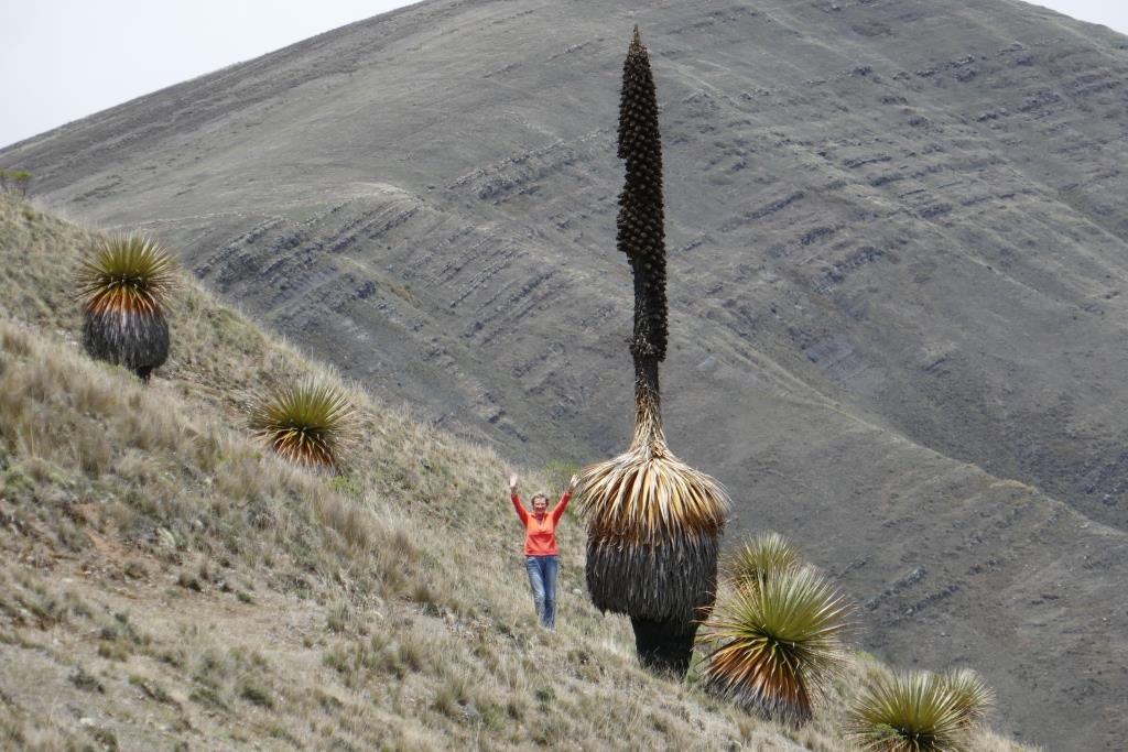 Ein Tagesausflug zum Pastoruri-Gletscher, auf über 5000m wäre toll. Jedoch ist das Wetter unsicher. Daher fahren wir (d.h. Heinz fährt) die Steilhänge der Cordillera Negra hinauf, über eine abenteuerliche Strasse , mal löchriger Asphalt, mal ausgewaschenes Ripio und gefühlten hundert Haarnadelkurven. Und das alles nur, um die Riesenbromelien zu sehen, die auf viertausend Metern Höhe wachsen. In allen Wachstumsphasen stehen sie da. Bis 8m hoch werden sie. Wirklich eindrückliche Pflanzen.