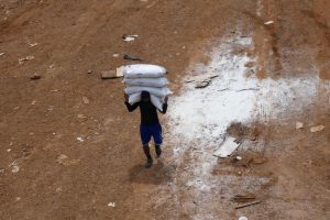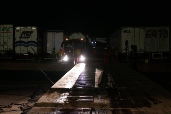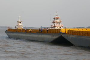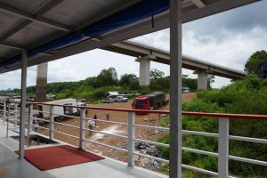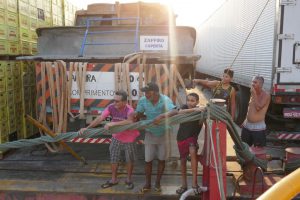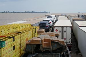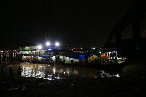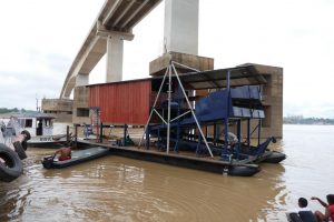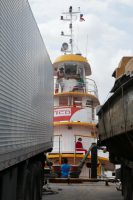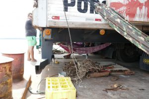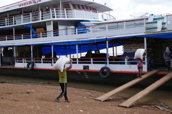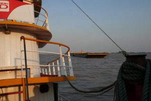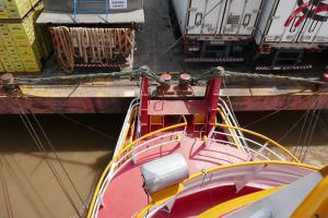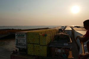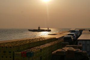 Morgenspaziergang zur Anlegestelle. Es wird weiter abgeladen. Die Balsa besteht aus einem riesigen Ponton und einem Schubschiff. Unvorstellbar was da alles drauf Platz hat. Zuerst werden die Lastwagen mit Zugfahrzeug und Lastwagenaufleger vom Schiff gefahren. Das sind an die 25 Stück. Unter einer grossen Abdeckplane stehen noch etwa acht Wagenladungen Bierharasse mit Inhalt. Die vollen werden ausgeladen, die leeren eingeladen. Und was versteckt sich unter den beiden anderen Planen? Etwa vier Doppelladungen Zementsäcke. Endlich ist er Ponton leer und es kann geladen werden.