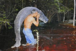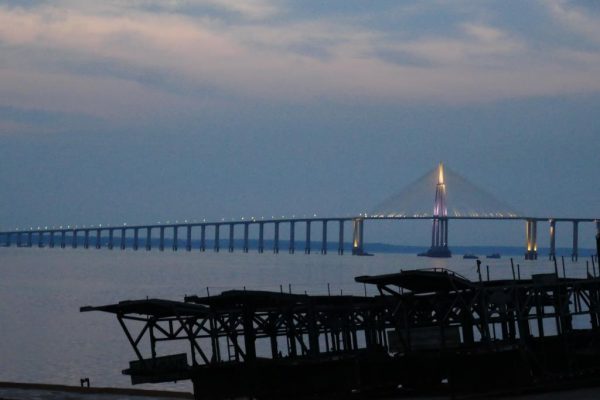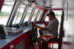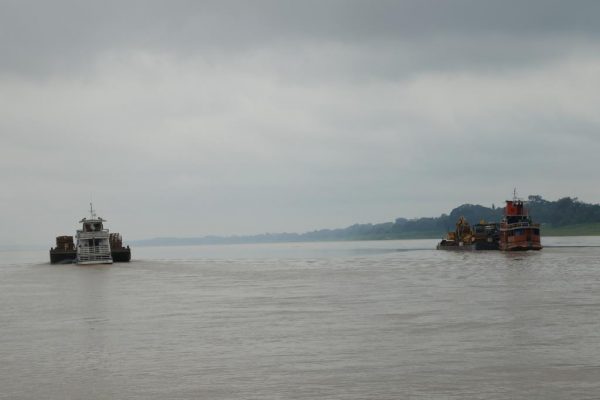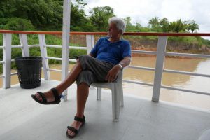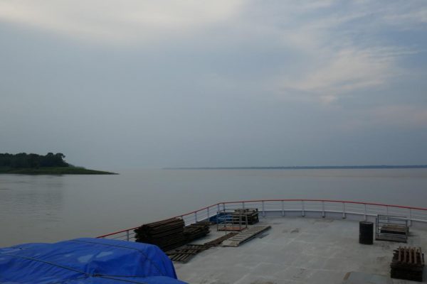 Der blaue Morgenhimmel verspricht einen schönen Tag. Nach dem Almoco sitzen wir am Bug mit Blick auf den von Urwald eingefassten Amazonas. Maschinenstopp? Wir dümpeln eine Weile und erfahren dann, dass zwei zusätzliche bewaffnete Security-Männer an Bord gebracht werden. Eine grosse, leere Balsa der TCD fährt längsseits und die Männer setzen über. Zu fünft sollen sie uns vor etwaigen Piratenübergriffen schützen. (Schluck).