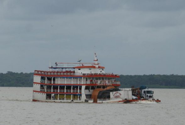 Wieder im breiten Amazonasarm angekommen, wird das Schiff bei einer Insel gestoppt. Ein Crewmitglied klettert an Land, schlingt eine Trosse um einen Baum und hier warten wir die Flut die vom Atlantik den Fluss hinauf gedrückt wird ab. Ausser dass der Wasserspiegel leicht ansteigt merke ich wenig davon. Gemächlich fahren wir danach weiter. Ein kräftiger Regenguss treibt alle in die Kabinen oder unter die Lastwagen.