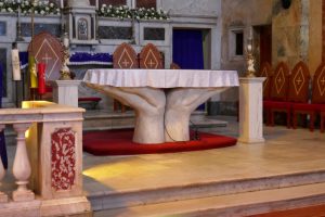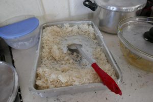 Café da Manha gibts um sechs, Almoco um elf, Jantar um fünf. Gegessen wird in der Küche, vier Personen haben Platz auf der Bank, daher herrscht Schichtbetrieb.