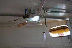 Am Morgen Erkundungsgang zum Schubschiff. Einfachste Toiletten, aber wenigstens geräumig und mit einer Duschbrause an der Decke. Das Lavabo wird glaub ich mit Schweröl geputzt. Gleich daneben dröhnt der Schiffsmotor. Halb taub verlasse ich das gar nicht stille Örtchen.