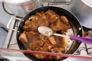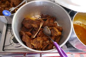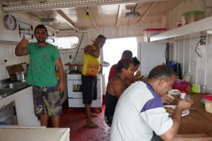 Zum Almoco gibts wie gehabt, Reis, Spaghetti, Pouletstückli, undefinierbares Fleisch und Bohneneintopf. Die Küche ist zugleich Essraum. Abenteuerlich einfach. Nachher sitzen wir auf unseren Klappstühlen zuvorderst auf dem Schiff und lassen uns den Fahrtwind um die Ohren wehen.