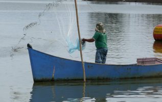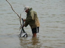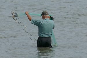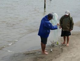 Hier wird auf spezielle Art gefischt. die Fischer stehen im seichten Wasser, mit Wurfnetzen ausgerüstet, und die Delfine treiben die Fische in die Nähe der Fischer. Im richtigen Moment, schwupp, das Netz fliegt, und der Fisch zappelt drin. Unglaublich, aber so klappt es ……