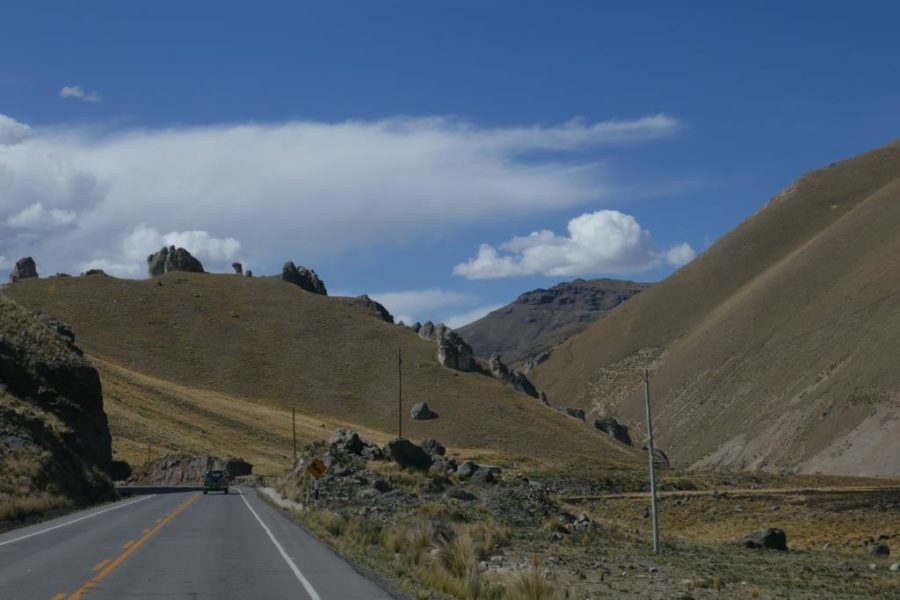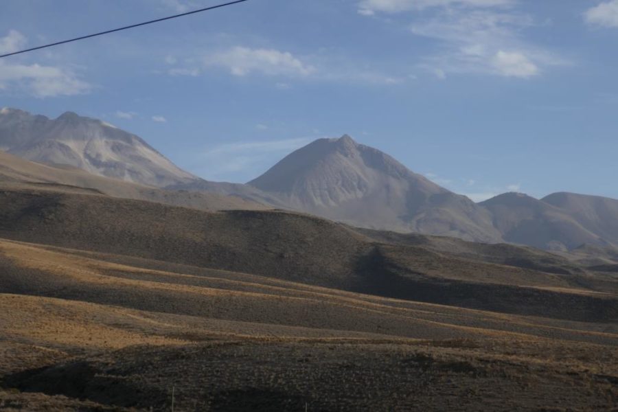 Der Brujito erhält eine Aussenwäsche und dann verlassen wir Puno. Der Weg führt uns über Juliaca und St. Lucia über ein Hochplateau, 4500müM. Wunderschöne Landschaft, riesige Lamaherden, karges Gebirge, zierliche Vicunas. In Richtung Puno, grüne Oasen. Der Vulkan Sabancaya schickt eine gewaltige Rauchwolke in den Himmel.