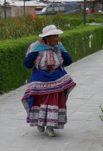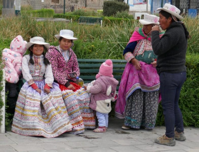 Endlose Lastwagen-Kolonnen in der Nacht. Wenig geschlafen. Weiterfahrt mit Ziel zum Montana de siete Colores zu gelangen. Auf einer halsbrecherischen Strasse, ohne Netz und doppeltem Boden, d.h. ohne Leitplanken fahren wir in Richtung Montana Arco Iris wie er auch heisst. Zwei Haarnadelkurven befahren wir im Schritttempo. Falls wir das bei Regen fahren müssen und ins Rutschen kommen ….! In Japura setzt wieder Regen ein. Kurzentschlossen kehren wir um. In Pitumarca bleiben wir auf der Plaza des Armas. Der Ort scheint vom Tourismus verschont zu sein. Viele Frauen drehen ihre Spindeln während sie unterwegs sind. Reich bestickte Trachten.