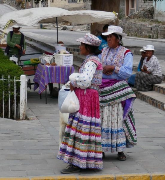 Von dort geht es der Colca-Schlucht entlang. Immer wieder Ausblicke hinunter in die atemberaubende Tiefe. Erreichbar über Zickzackwege, scheinen die Häuser an den Steilwänden zu kleben. Terrassierte Äcker. Frauen bei der Ernte.